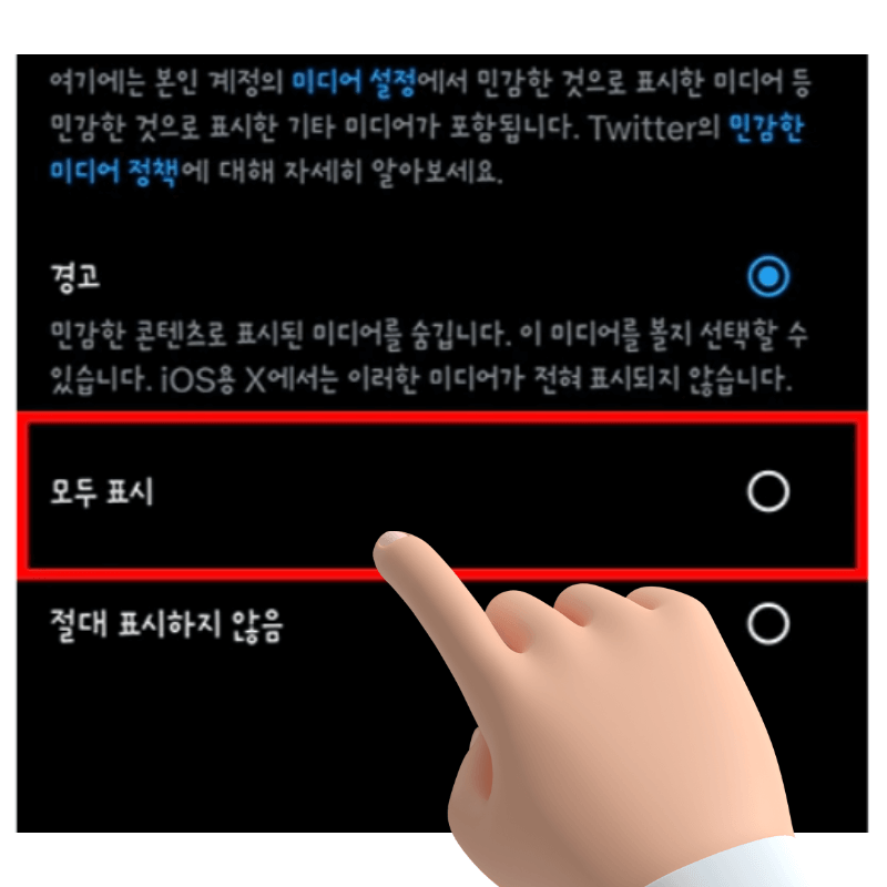 트위터(X)에서 민감한 콘텐츠를 해제하려면 ‘모두 표시’를 선택해 주세요. 따로 저장 버튼을 누르지 않아도 뒤로 가기를 하면 자동으로 적용됩니다. 이후부터는 가림막 없이 바로 게시글의 사진과 동영상을 확인할 수 있습니다.
