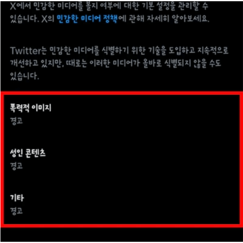 트위터(X)에서 말하는 민감한 콘텐츠는 크게 폭력적 이미지, 성인 관련 미디어, 기타 민감한 표현으로 나누어집니다. 기본적으로는 사용자 보호를 위해 경고 화면이 먼저 나오도록 설정되어 있어요.